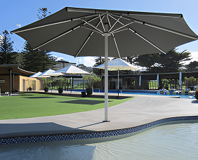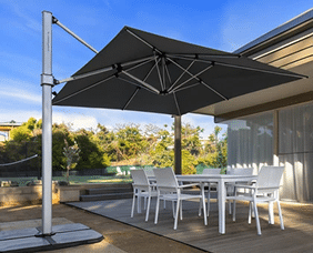 Heavy‑duty cantilever system for expansive coverage. Structural strength makes it appropriate for hotels and properties requiring large shaded zones with minimal ground obstruction.